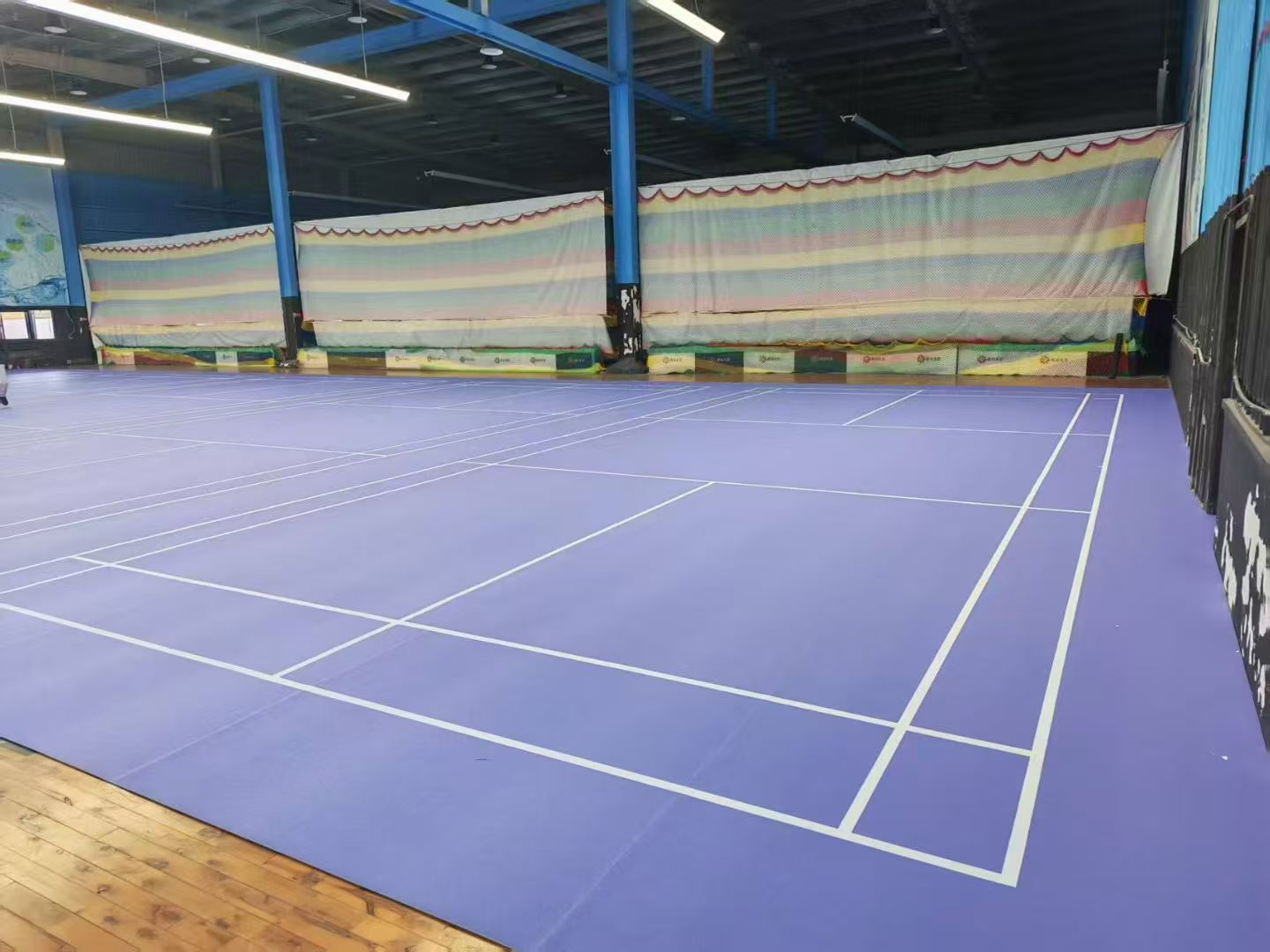 划线:按照羽毛球场地的标准尺寸,使用美纹纸和油墨进行划线,待油墨干后撕掉美纹纸。